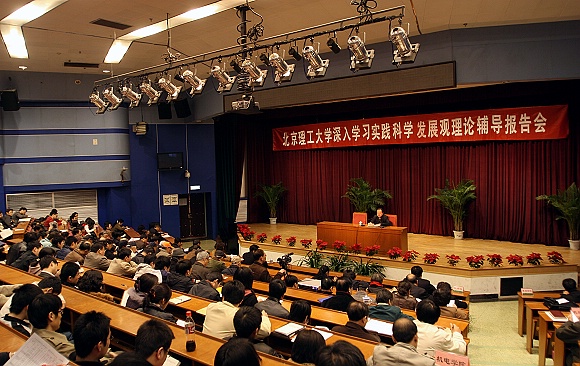 我校黨委副書記、深入學(xué)習(xí)實(shí)踐科學(xué)發(fā)展觀活動(dòng)領(lǐng)導(dǎo)小組副組長(zhǎng)、辦公室主任侯光明主持了學(xué)習(xí)會(huì),黨委書記郭大成、全校處級(jí)干部以及黨支部書記、骨干教師代表、離退休教師代表、學(xué)生代表等近500人參加了集中學(xué)習(xí)。