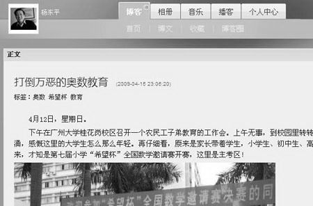與此同時,北京理工大學文學院教授、21世紀教育發展研究院院長楊東平在其個人博客(blog)上發表文章,稱要“打倒萬惡的奧數教育”,并稱奧數教育對少年的毒害比“黃賭毒”還厲害。楊教授的言論,立刻在互聯網上引起廣泛關注。