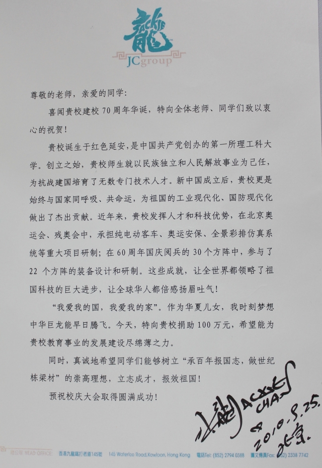 在北京理工大學迎來70周年華誕之際,成龍先生向學校慷慨捐贈100萬元人民幣,并發來賀信預祝校慶活動圓滿成功!