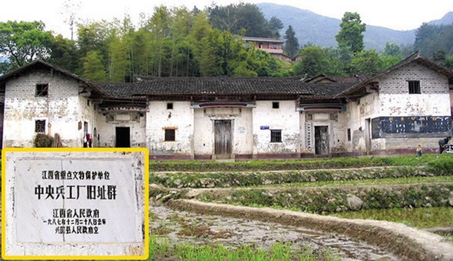 位于江西省興國縣興連鄉官田村的官田中央兵工廠,是中國工農紅軍在1931年10月第三次反“圍剿”后建立了第一個兵工廠,它標志著我黨領導的綜合性大型兵工廠的形成和兵器工業的發端,被譽為人民兵工的源頭和國防工業的搖籃。