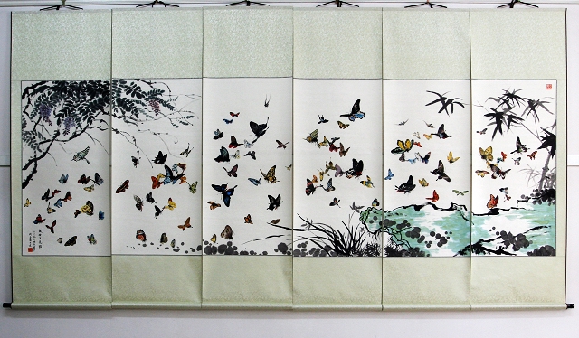 畫展展出了周本相老師創作的中國畫蝴蝶作品近百件。主要作品有六扇屏“盛世飛花百蝶圖”,“瓷板百蝶圖”,銀杏葉刻畫百蝶圖等。尤其是“盛世飛花百蝶圖”展示了周老師近年來從工筆蝴蝶到寫意蝴蝶技法的一個探索性成果。