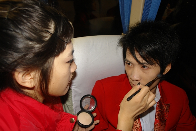 為了達(dá)到最佳表演效果,在去往廣場的路上,許多生平從未化過妝的男同學(xué)在女同學(xué)的幫助下迅速地面貌一新。