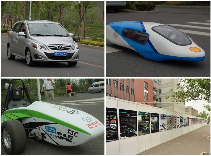 本次汽車文化節開幕式動態車展中,北京汽車E系列轎車與我校自主研制的節能車先后進行了動態展示,讓同學們近距離領略了北京汽車的魅力和我校自主創新的水平,現場爆發出陣陣掌聲。隨后,參會嘉賓與師生代表饒有興趣地觀看了參展車輛靜態展示與圖片展。北京汽車E系列、我校大學生方程式賽車、節能車和電鉆車參加了開幕式車展。