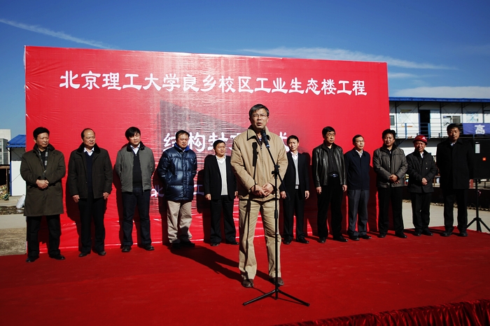 參加工業生態樓封頂儀式的領導分別代表良鄉高教園區、設計、施工、監理和業主單位發言。趙平副校長代表學校對辛勤施工的參建人員表示衷心感謝,對工程實現結構封頂和取得的成績表示祝賀,勉勵施工企業和監理單位再接再勵,把工業生態樓鑄造成北京理工大學的精品工程。