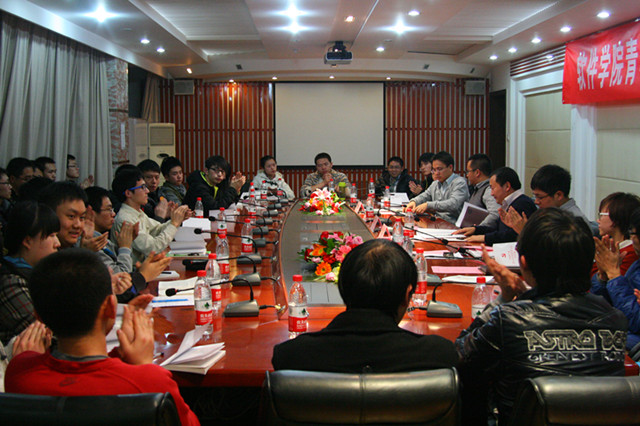2012年11月27日,軟件學院青年學子十八大專題學習座談會在軟件樓208會議室召開。學生處副處長徐建老師、全國青聯委員王樹良教授、軟件學院團委書記陳杰浩老師、各年級輔導員以及青年學生代表參加了本次學習座談會。會議由陳杰浩老師主持。