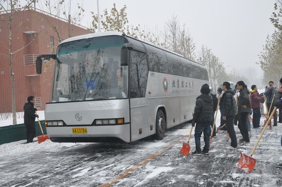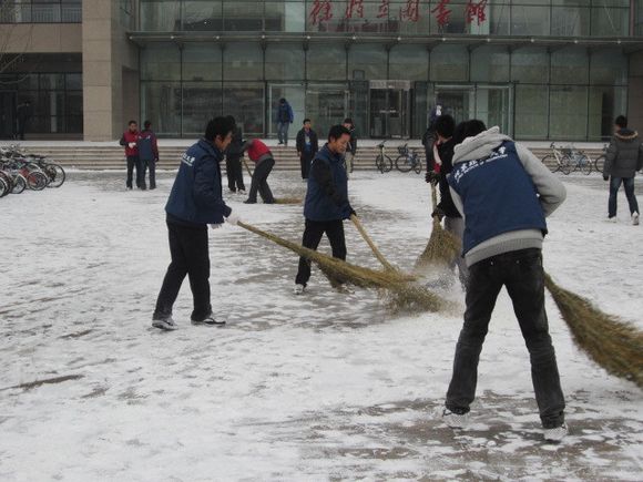 2012年12月14日,隆冬初雪,皚皚白雪覆蓋了整個良鄉校區,為了保證校園內交通順暢,減少危險發生,基礎教育學院與學校后勤部門商定由物業提供工具,組織機械學部、信息學部一部、信息學部二部、理材學部共80名志愿者學生及部分輔導員于當日中午清掃校區積雪,延河之星志愿者總隊也組織20余名骨干成員參與其中。