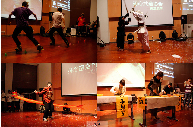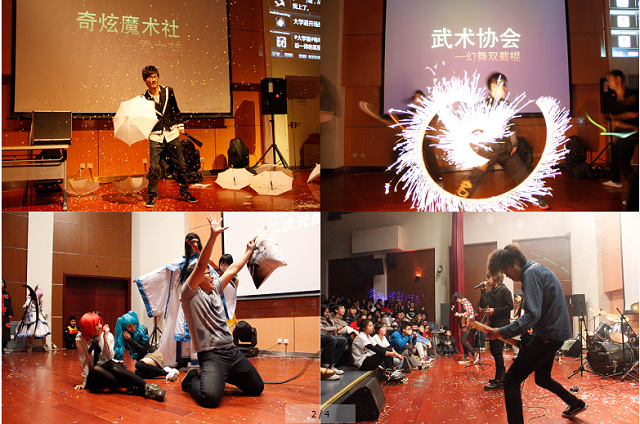 跆拳道的功夫秀顯示出其成員的深厚功力,無陽齋充滿意境的表演將音樂與書法融合起來,悅音唯美動人的演唱也讓臺下的觀眾連連叫好。還有酷愛輪滑社技藝精湛的表演、劍道社令人振奮的劍道展示、抖之道空竹社的絕妙演出、龍藝社與無陽齋書畫社的中國風、BIT Crew街舞社動感十足的舞蹈更是點燃了晚會現場的氣氛。