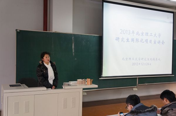 為了更好地提升我校研究生的國際化水平和視野,幫助研究生了解我校研究生國際化項目相關情況,為廣大研究生申請公派留學工作做好服務,研究生院于2012年12月24日下午組織了2013年度北京理工大學研究生國際化項目宣講會。研究生院培養處副處長張景瑞教授參加了宣講會,甄禎老師作為項目主講人。