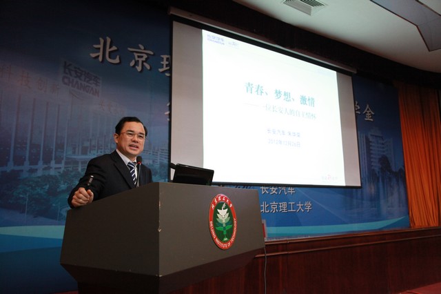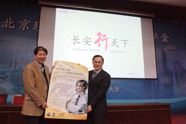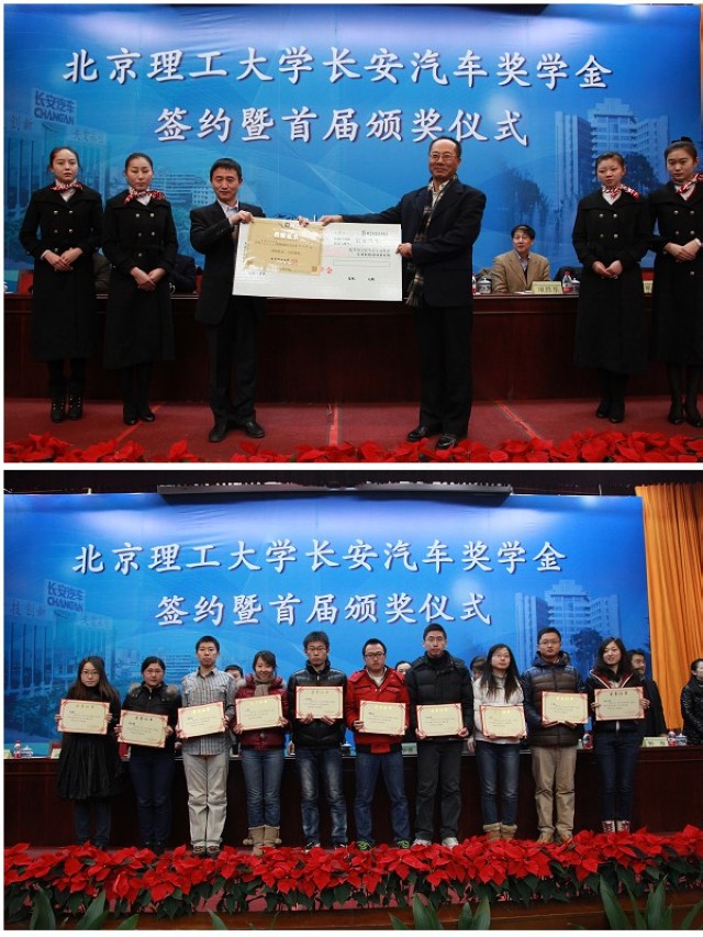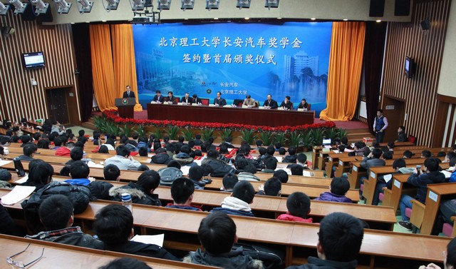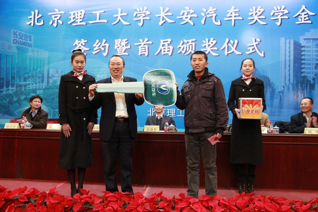 2012年12月26日下午,北京理工大學長安汽車獎學金簽約暨首屆頒獎儀式在中關村校區中心教學樓報告廳順利舉行。長安汽車黨委書記、副總裁朱華榮,長安汽車工程研究總院副院長兼北京院書記吳禮軍,長安汽車工程研究總院副院長劉明,北京理工大學副校長孫逢春,北京理工大學校長助理、良鄉校區管委會主任姚利民,北京理工大學黨委研究生工作部部長郝洪濤,北京理工大學黨委學生工作部部長楊海,北京理工大學校團委副書記方蕾,北京理工大學機械與車輛學院院長項昌樂出席了此次活動,儀式由機械與車輛學院副書記副院長范文輝主持。