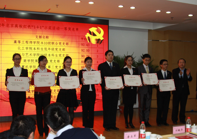 經(jīng)過激烈角逐,北京理工大學(xué)設(shè)計與藝術(shù)學(xué)院2009級本科生黨支部最終以第三名的好成績獲得北京高校紅色“1+1”活動一等獎,市委教育工委副書記唐立軍為獲獎黨支部進行了頒獎。