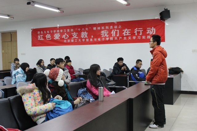 由北京理工大學信息與電子學院團委主辦,學院共產主義學習實踐會承辦的“紅色愛心支教 我們在行動”系列活動于2012年12月10日拉開序幕。本次“紅色愛心支教,我們在行動”是信息與電子學院學習十八大精神系列活動之一,包括三個部分:1. 面向北京理工大學全體學生招募支教活動志愿者,吸收新鮮血液補充明圓支教隊伍,廣泛宣傳支教活動;2. 共產主義學習實踐會邀請有豐富支教經驗的志愿者對新加入的志愿者展開系列培訓;3. 前往明圓學校開展支教活動,向同學們宣傳講解黨的十八大精神,為打工子弟開展理想信念教育。