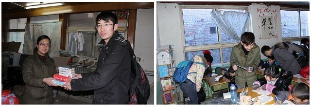 12月18日下午,志愿者來到明圓學校時同學們還在上課。帶隊負責人劉紹榮代表志愿者隊伍向學校捐贈了學生急需的棉手套和學習資料等物品。隨后,志愿者與六年級的同學展開了豐富多彩的互動活動。通過一對一的輔導與交流,支教團成員為學生宣傳講解十八大精神,幫助學生解決學習上的難題,拓寬視野,培養學習樂趣,同時讓他們更多的了解外面的世界。