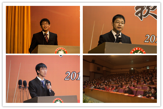 大會分別表彰了在學(xué)生工作、科技創(chuàng)新方面表現(xiàn)出眾的同學(xué),以及被寄予厚望的六名本科11級的“未來之星”。表彰環(huán)節(jié)首先播放獲獎事跡視頻,與在場的所有觀眾一同見證了這些優(yōu)秀的同學(xué)們在取得成功道路上那些不為人知、默默付出的故事。接著主持人宣讀頒獎詞,表達(dá)了學(xué)院對這些優(yōu)秀學(xué)生的肯定。最后,與會領(lǐng)導(dǎo)、老師作為頒獎嘉賓上臺為獲獎學(xué)生一一頒獎。優(yōu)秀學(xué)生干部獲獎學(xué)生代表王子實同學(xué)、科技創(chuàng)新獎獲獎代表陳博同學(xué)、“未來之星”獲獎代表郭翔宇同學(xué)與2012屆優(yōu)秀校友張旭依次上臺發(fā)言,激勵著臺下更多的同學(xué)以他們?yōu)榘駱佣鴬^斗。