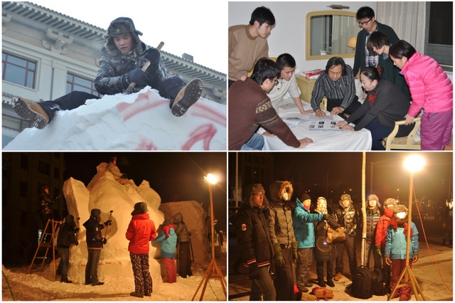 北京理工大學(xué)代表隊(duì)由設(shè)計(jì)學(xué)院黨委副書記、副院長孫飛帶隊(duì),設(shè)計(jì)學(xué)院傳統(tǒng)工藝美術(shù)系魯明非隨隊(duì)前往哈爾濱。為了保質(zhì)保量完成作品,隊(duì)員們每天早上八點(diǎn)就開始工作,晚上在零下30攝氏度的嚴(yán)寒中借助大賽組委會提供的照明燈,一直工作到晚上十點(diǎn)才休息。師生們一起戰(zhàn)嚴(yán)寒、斗冰雪,在哈爾濱近十年來最冷的冬天里,充分發(fā)揚(yáng)了艱苦奮斗的延安精神,經(jīng)過4天的奮力拼搏,最終出色的完成了雪雕作品。