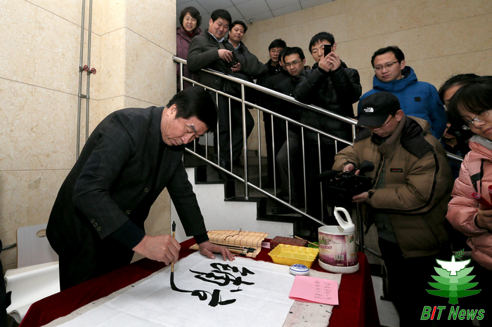 會后,與會領導及嘉賓向同學們贈送了吉祥物,并到會場外的春聯書寫現場,為同學們贈送退休老教師們現場書寫的春聯。郭大成書記親自執筆為回家學生書寫春聯。工會宣傳部部長王玉偉老師現場為同學們作畫,表達對家庭經濟困難學子的關愛。