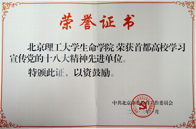 黨的十八大勝利召開以來,根據全市高校“學理論、鑄信念”主題宣傳教育活動要求,為加強效果,總結經驗,宣傳典型,市委教育工委在全市高校開展了學習宣傳黨的十八大精神先進單位和優秀活動申報評選工作。經北京市委教育工作委員會組織專家評審,北京理工大學生命學院獲得“首都高校學習宣傳黨的十八大精神先進單位”榮譽稱號。