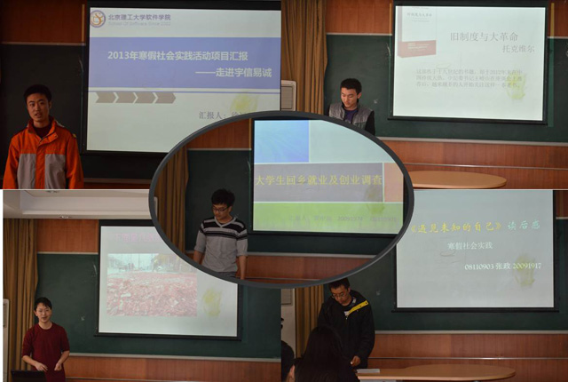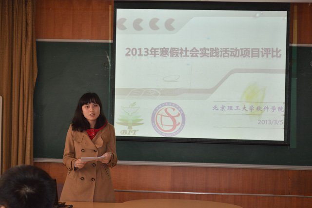 軟件學(xué)院于2013年3月5日13:00在軟件樓207報(bào)告廳召開了2013年軟件學(xué)院寒假社會(huì)實(shí)踐項(xiàng)目評(píng)比活動(dòng)。出席此次活動(dòng)的評(píng)委有學(xué)生工作辦公室的方平老師、路艾杰老師、劉今朝老師和柳文艷老師。此次評(píng)比活動(dòng)各位同學(xué)分別將自己的實(shí)踐項(xiàng)目向評(píng)委老師和同學(xué)進(jìn)行了精彩地匯報(bào)。匯報(bào)順序在評(píng)比活動(dòng)前抽簽決定。首先主持人向大家介紹了各個(gè)評(píng)委老師以及此次寒假社會(huì)實(shí)踐活動(dòng)的意義。