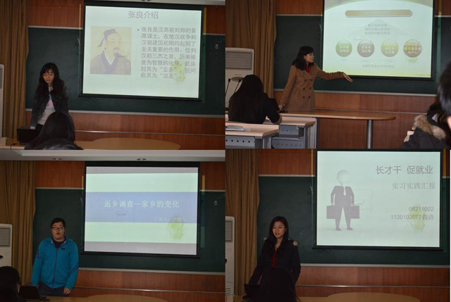 任天天同學(xué)通過(guò)自己的項(xiàng)目帶領(lǐng)大家領(lǐng)略了一次有著豐厚文化底蘊(yùn)的張良廟;張楨同學(xué)的西安物流業(yè)發(fā)展調(diào)查,同樣也給大家留下了深刻的印象。接下來(lái)上場(chǎng)匯報(bào)的許曉東同樣將自己的項(xiàng)目立足于家鄉(xiāng),詳細(xì)闡述了自己家鄉(xiāng)近些年的巨大變化,尤其在信息產(chǎn)業(yè)方面;陳詩(shī)同學(xué)介紹自己利用寒假一個(gè)月的時(shí)間參加工行實(shí)習(xí)的經(jīng)歷等等,每位同學(xué)的精彩匯報(bào)贏得了評(píng)委的好評(píng)和同學(xué)們的熱烈掌聲。