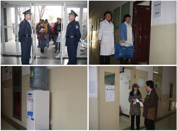 為了保障考試順利進行,學校辦公室統籌協調各部處工作任務,發布了封樓通知;后勤集團調動人力對考場教室設備、飲水設施等做了精心準備,為考生提供了便利的考試環境;保衛處工作人員早上7點就到崗執勤,對考場進行封閉管理,維持考場周邊交通秩序,創造了良好的治安環境;校醫院選派四名醫務人員在醫務區服務,為考生提供全程醫療保障;相關部處負責人員在考試進行期間對考場進行巡視巡查。