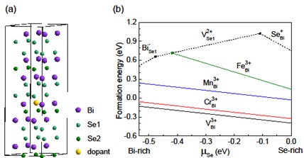 圖1. (a) 2×2×1 Bi2Se3超胞原子摻雜結構示意圖。(b) V, Cr, Mn 和Fe摻雜Bi2Se3體系最穩定價態的形成能隨制備環境(硒化學勢)的變化。為比較,虛線給出了Bi2Se3中最可能存在的本征缺陷(硒空位VSe1、BiSe1和SeBi反位)的數值。