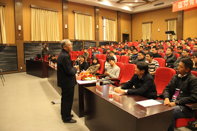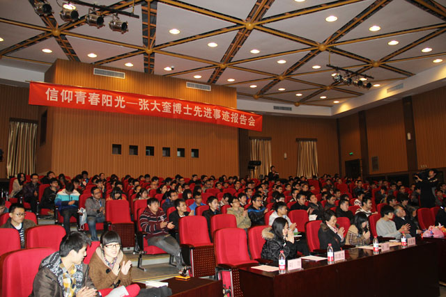 2013年3月29日下午4點,由計算機學院主辦的"信仰·青春·陽光"張大奎博士先進事跡報告會在七號樓報告廳隆重舉行。青年勵志榜樣張大奎博士,其導師樊孝忠教授,學校黨委宣傳部,學生工作處,校團委和計算機學院的領導、老師出席了會議,來自全校各個專業的200余名同學認真聽取了報告。