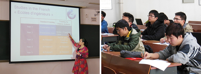 此外,圖爾大學(xué)工程師學(xué)院、奧爾良大學(xué)工程師學(xué)院分別詳細反饋了我校歷屆學(xué)生在法國的學(xué)習(xí)情況,項目運行良好。我校自2008年開展了本項目,先后有68名同學(xué)參加項目,2013年9月將有11名同學(xué)赴法學(xué)習(xí)。當天下午1:00,圖爾大學(xué)工程師學(xué)院的老師為我校學(xué)生介紹了赴法訪學(xué)及讀研項目,以及圖爾大學(xué)工程師學(xué)院和奧爾良大學(xué)工程師學(xué)院的相關(guān)情況,并回答同學(xué)們的問題。