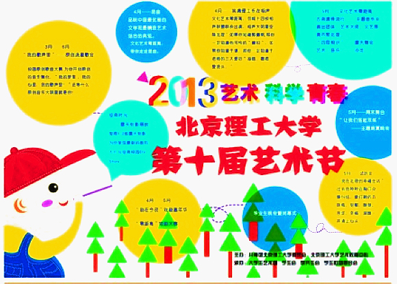 北京理工大學第十屆藝術節,延續了上屆“開放、引領、服務”的理念,以廣大師生喜聞樂見的形式,持續在校園內推出一系列精彩的文化藝術活動,與此同時本屆藝術節更加重視“參與性”與“互動性”,比如組織了“零距離短劇大賽”、“我的歌聲里——原創歌曲大賽”以及校園書畫攝影大賽等,讓愛好藝術的青年師生在參與中體驗藝術的魅力,感受藝術節的“節日”氛圍。藝術節將為豐富我校師生、校友文化生活,提升藝術審美情趣,營造濃厚的校園文化氛圍做出貢獻。
