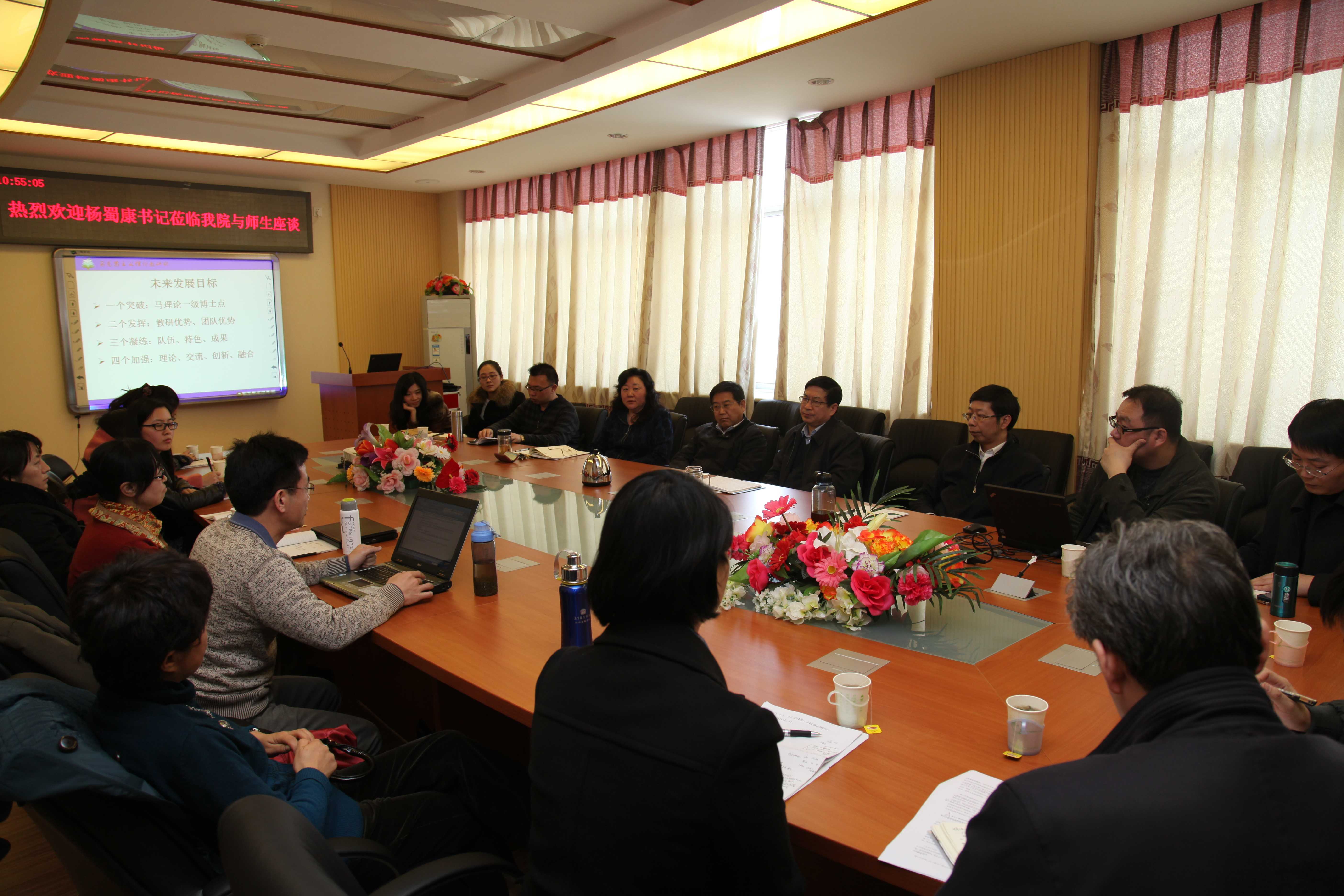 2013年4月3日,校紀委書記楊蜀康與馬克思主義理論教研部教師就我校馬克思主義理論學科發展與建設等問題在中心教學樓1318會議室進行座談。馬克思主義理論教研部主任張紅峻、常務副主任李林英以及五個二級學科的負責教師和青年教師代表、碩士研究生參加了座談會。