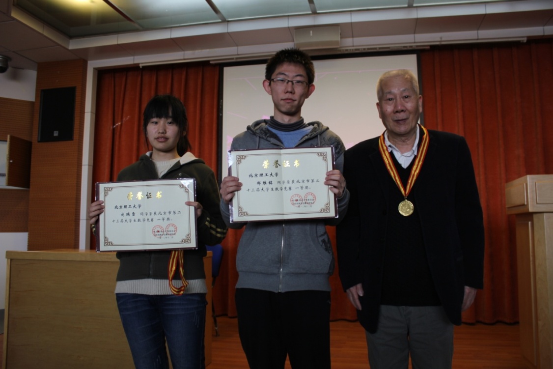 大會開始時,基礎教育學院副院長程杞元教授宣讀了獲獎名單。在本屆全國大學生數學競賽中,我校學子喜傳佳績,獲得驕人的成績,共有36名學生榮獲市級獎項,其中劉雪瑞同學尤為出色,成為北京賽區晉級全國賽的16名選手之一,最終獲得全國大學生數學競賽總決賽三等獎,實現了我校參加全國大學生數學總決賽零的突破。林群院士親自為她頒獎,并合影留念。