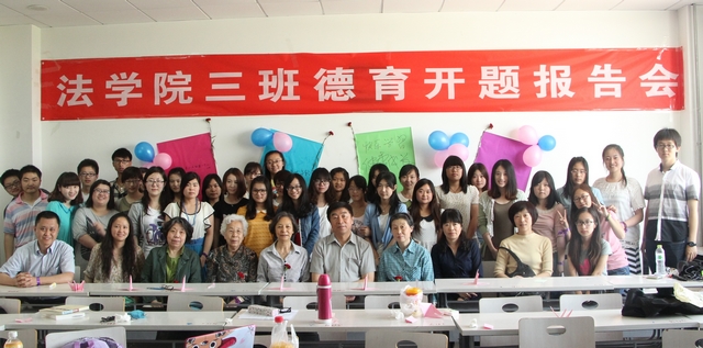 2013年5月11日、12日,法學院2012級三個班級的德育開題會相繼舉行,北京理工大學黨委書記郭大成、法學院和離退休教職工黨委聯合聘請的離退休老干部德育導師殷惠萍、鄭鳳芝、張玉斌、周本相、趙長水、陳桂秀、江祖葒、韓自文;離退休教職工黨委書記婁秀紅、學生工作部副部長許欣、學生工作部教育科科長李冰、法學院黨委副書記副院長張巍、法學院團委書記聶寧寧、法學院團委副書記韓笑、班主任李華老師、于鵬老師,以及來自高年級的德育小導師們和所有2012級同學參與了此次德育開題,同學們和老師們一起分享了他們對已逝大學時光的反思和對未來大學時光的憧憬。