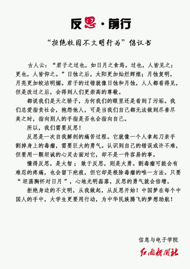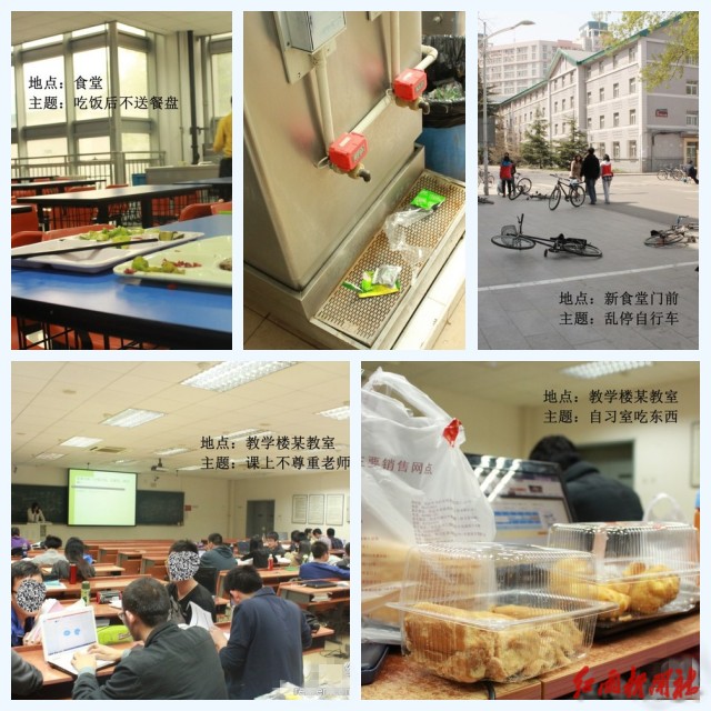 為舉辦反思文化展,信息與電子學院紅雨新聞社派出多路記者在校園中拍攝了多組照片,這些照片反映出發生在大學生身邊的不文明現象。一組組刺眼的照片上傳至官方微博、公共主頁和學生工作平臺后,引發了廣大同學對于維護校園文明、弘揚校園文化的熱烈討論。同學們紛紛留言轉發,自我反省,有則改之,無則加勉。“反思”,把積極向上、充滿希望的正能量傳遞給每一個人。