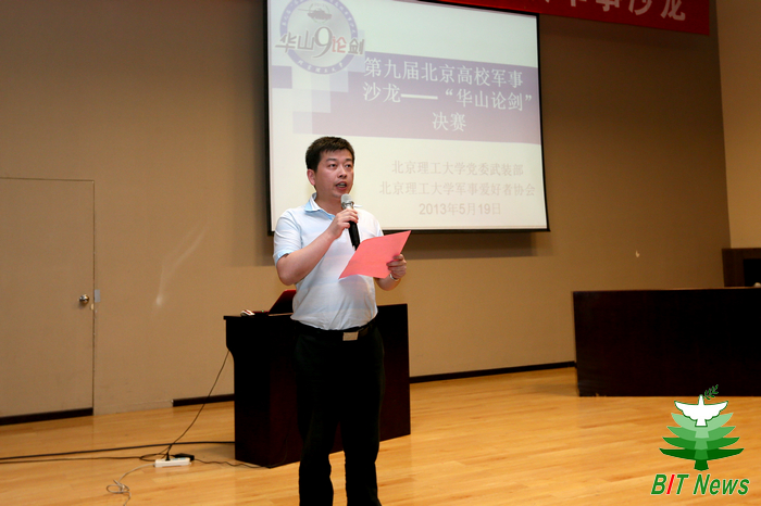 5月19日下午,第九屆北京高校軍事沙龍“華山論劍”決賽在我校七號樓報(bào)告廳舉行。北京高校國防教育協(xié)會常務(wù)副秘書長王德峰、中國人民解放軍駐北京理工大學(xué)國防生選拔培訓(xùn)辦公室賈志宏、國際關(guān)系學(xué)院武裝部李萍、北京理工大學(xué)黨委宣傳部副部長王征、團(tuán)委副書記周明宇、武裝部副部長徐建出席決賽,國防大學(xué)軍事戰(zhàn)役教研室主任孫旭教授、戰(zhàn)役教研部軍事理論教研室副主任孟慶全教授、北京理工大學(xué)機(jī)械與車輛學(xué)院吳志成副教授、魏巍副教授擔(dān)任本次比賽的評委。