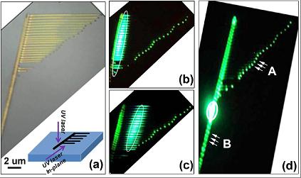 為此北京理工大學納米光子學與超精密光電系統(tǒng)北京市重點實驗室的劉瑞斌副教授、碩士生張春花在鄒炳鎖教授帶領下,在基金委青年基金、校創(chuàng)新團隊基金、校重大預研基金等項目支持下,在一維半導體陣列結構制備及光子學行為的研究上取得了重要突破:利用本團隊前期首次實現(xiàn)的II-VI族半導體周期性超晶格--CdS/SnS2一維光子晶體線(http://pubs.acs.org/doi/pdf/10.1021/ja1037963)為基體模板,通過反復試驗,成功發(fā)明了一種一步氣相法制備CdS一維單晶線陣列梳狀結構的方法, 獲得了角度可調、周期尺度可調的梳狀結構,并與海外合作者研究了其微結構和高效的光波導行為(見下圖),結果顯示不同方向傳播的光子耦合效率比量子線交叉?zhèn)鞑ゴ蟠笤鰪姡瑸橄乱徊揭痪S微納光子器件的構建與應用打下了堅實的基礎。