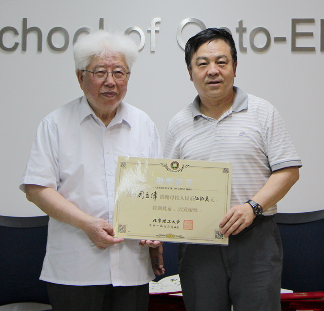 會(huì)議宣布周立偉獎(jiǎng)助學(xué)基金第一屆理事會(huì)成立,它由光電學(xué)院及基礎(chǔ)教育學(xué)院教授和領(lǐng)導(dǎo)組成。理事會(huì)聘任周立偉、倪國(guó)強(qiáng)、薛唯、郝群、鄒銳、王涌天、李艷秋、趙維謙、金偉其、高春清、趙躍進(jìn)、王悅音、張青山、叢磊為理事;周立偉任理事長(zhǎng),倪國(guó)強(qiáng)、郝群、王悅音任副理事長(zhǎng),倪國(guó)強(qiáng)兼任秘書長(zhǎng),周霞任秘書。楊賓副校長(zhǎng)向各位理事發(fā)放了聘書,向周立偉院士頒發(fā)了捐贈(zèng)證書。