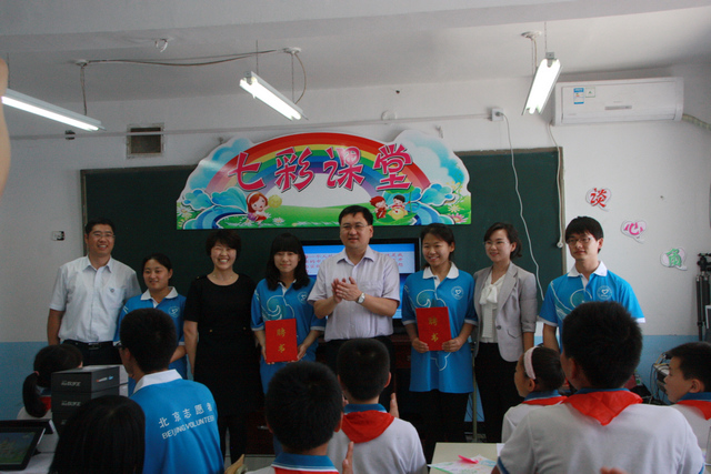 5月30日下午,我校延河之星志愿者總隊支教部、博冠天文社組織20余名志愿者赴房山區京蓼學校開展以“中國夢·七彩夢”為主題的關愛農民工子女活動。我校志愿者以“講夢、曬夢、圓夢”為主要內容,精心準備了趣味體育課、科普天文課、書法寫作課和主題班會,為孩子們慶祝六一兒童節的到來。團中央志愿者工作部部長郭美薦、北京市志愿服務指導中心副主任陳炳具、房山團區委書記肖丹,以及校團委副書記肖坤等一同觀摩并參加了活動。