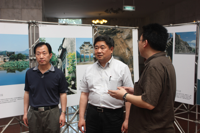 單霽翔院長在我校黨委副書記、副校長李和章,校團委書記藺偉、設計與藝術學院院長楊建明、書記郭宏等陪同下共同參觀了主題圖片展。中國文物學會世界遺產研究委員會副會長兼秘書長張義生也出席了此次活動,并表示學會將加強與高校的學術合作,共同搭建遺產保護的研究平臺。