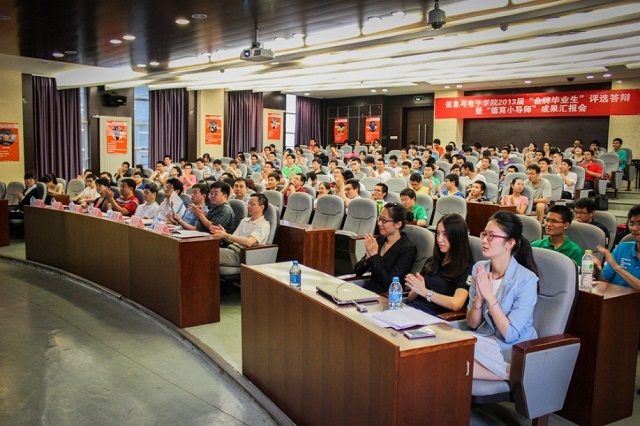 隨后,大會(huì)舉行了“金牌畢業(yè)生”候選人答辯會(huì)。史玥婷、張劍坤、李麗日等10名來(lái)自2013屆“德育小導(dǎo)師”中的佼佼者依次上臺(tái)進(jìn)行了答辯。參與答辯的“德育小導(dǎo)師”或成績(jī)優(yōu)異、競(jìng)賽突出,或統(tǒng)籌兼顧,學(xué)習(xí)工作兩不誤,或始終堅(jiān)持不懈,追尋夢(mèng)想……他們有著不同的經(jīng)歷,在不同的領(lǐng)域有著出色表現(xiàn)。他們不僅以優(yōu)異的專業(yè)成績(jī)、杰出的競(jìng)賽結(jié)果、學(xué)游多國(guó)的經(jīng)歷和學(xué)生工作的完美成果體現(xiàn)了信息與電子學(xué)院學(xué)生品學(xué)兼優(yōu)的優(yōu)秀品質(zhì),也以他們對(duì)學(xué)術(shù)、德育工作等多方面不懈追求的精神感染了所有人。