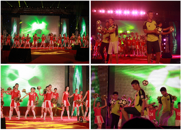 由管理與經(jīng)濟學院同學們表演的《加油!北理工》表達了所有理工人的“足球情結(jié)”,特別是節(jié)目中,盧斌等球隊主力球員突然出現(xiàn)在舞臺上,將手中的簽名球拋向觀眾,這一意外的驚喜,將晚會推向一個新的高潮。