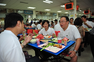 午飯時間,同學們來到學校食堂品味學生餐,端著餐盤在窗口排隊,四個人擠在一張飯桌前,仿佛又回到了當年的求學生涯。