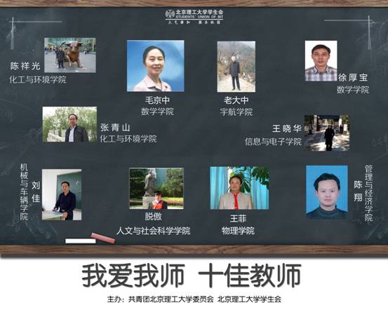 日前,第八屆北京理工大學“‘我愛我師’——我心目中最優秀教師”評選活動落下帷幕,宇航學院老大中老師、化工學院張青山老師、陳祥光老師、機車學院劉佳老師、管理學院陳翔老師、數學學院毛京中老師、信息學院王曉華老師、物理學院王菲老師、人文學院脫傲老師、數學學院徐厚寶老師,被學生評為本屆“我愛我師”活動十位“最喜愛的老師”。