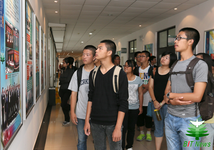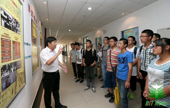 今年,組織全體本科新生在良鄉校區參觀校史展是學校歷史上第一次。雖然校史館已于2010年正式建成,接待了眾多的參觀者,成為了廣大師生、校友和社會各界了解學校的重要窗口,起到了很好的宣傳和教育作用,但由于校史館建在中關村校區,而本科生前兩、三年又在良鄉校區學習,所以給新生入學后參觀校史館帶來諸多不便。今年校黨委宣傳部在校領導與各部門的大力支持下,在良鄉校區綜合教學樓二層布置了新的“北京理工大學校史展”,使良鄉校區的師生們可以隨時了解學校的光榮史,為師生們增添了又一處內容豐富的“精神食糧”。校史展設在二層東、西兩側走廊,裝有專門的照明設備,寬敞明亮,在展覽的同時也極大美化了校園環境。展覽共有展板132塊,幾乎囊括了校史館中的精彩內容,并增添了不少最新的學校信息,成為了即校史館后又一個進行校情校史教育的重要基地。