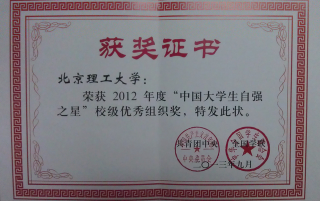 接著進行了“中國大學生自強之星提名獎” 、“中國大學生自強之星” 、“中國大學生自強之星”活動院校優秀組織獎的頒獎環節。北京理工大學榮獲“中國大學生自強之星”活動院校優秀組織獎,我校計算機學院的王穆容同學榮獲“中國大學生自強之星提名獎”。