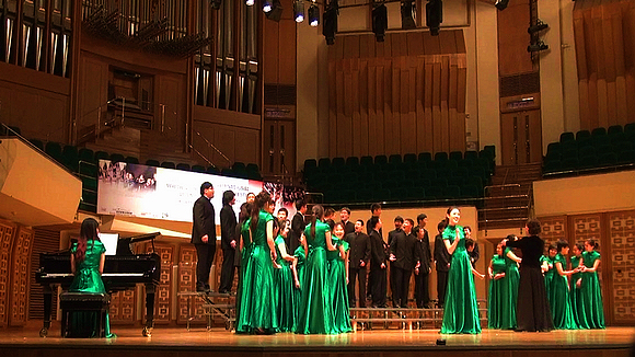 在本屆賽事中分量最重、競爭最激烈的混聲組比賽中,北理工學生合唱團在舞臺上先后演唱了《Lay a garland》(放上花環)、《天德而出寧》、《花兒里答出個話來》三首作品。《Lay a garland》是在合唱領域享譽世界的浪漫派八聲部復調曲目;《天德而出寧》取詞于《詩經》,是由著名作曲家陳樂昌先生創作的,在國內被譽為“最難駕馭”的無伴奏八聲部混聲合唱曲目;而《花兒里答出個話來》則是以具有濃郁的中國西部特色情歌對唱為題材的作品。我校學生合唱團在國際賽場上演繹這三首作品,一方面展現了中國大學生合唱團對于國外作品的閱讀能力,也全面展現了中國音樂家在合唱作品創作中的實力和水平,同時充分體現了中國民族文化的特色與精彩。特別是學生合唱團在演繹《花兒里答出個話來》時,創造性的融入了西方歌劇表演元素,再現了中國民間的婚禮場面,精彩的演出感染了現場觀眾,博得了經久不息的熱烈掌聲。最終我校學生合唱團以總分第四名獲得了混聲組的金獎,而憑借《花兒里答出個話來》的精彩表現,合唱團還獲得了組委會表演金獎。