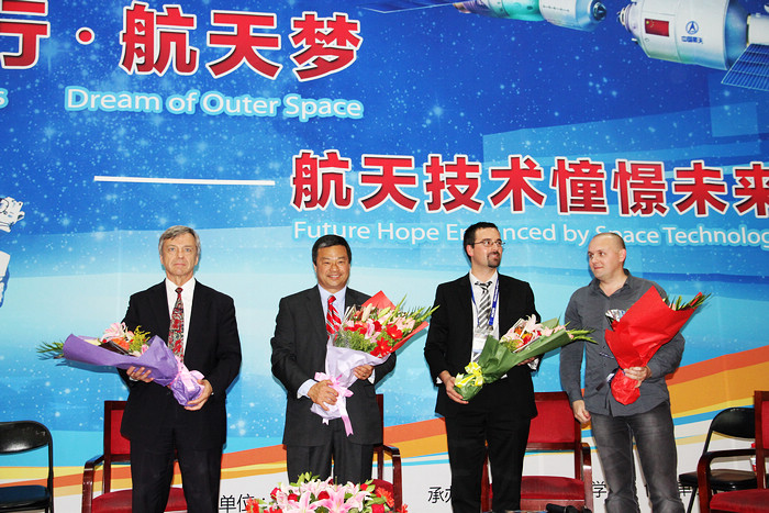 9月25日下午,由中國宇航學(xué)會主辦,北京理工大學(xué)、航天員雜志社承辦的“校園行,航天夢——航天技術(shù)憧憬未來”世界知名航天員訪談活動在北理工中心教學(xué)樓一層報告廳舉行。本次活動邀請美國航天員Leroy Chiao、加拿大航天員Robert Thirsk、火星500試驗指令長Alexy Sitev、火星500試驗乘員Romain Charles與北理師生開展面對面交流活動。