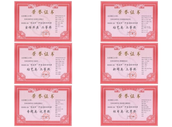 北京理工大學黨委宣傳部電視臺策劃制作和組織收集的7部視頻作品,日前喜獲2013年第三屆“視友杯”中國高校電視獎,其中《三輪車上的求學路》獲得專題類一等獎,其余作品獲宣傳片類二等獎1項、綜藝類二等獎2項、新聞類三等獎1項,專題類優秀獎1項,欄目類優秀獎1項。