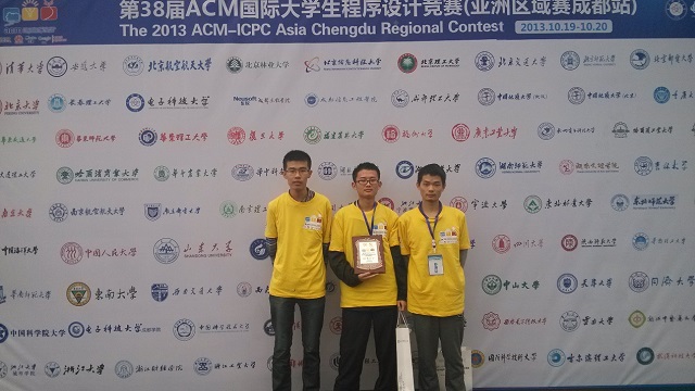 第三十八屆ACM國際大學生程序設計競賽亞洲區區域賽(成都賽區)于2013年10月19日在電子科技大學(清水河校區)舉行。北理工校級大學生軟件科技創新創業基地派出由本科2011級的劉果、張偉、沈卓輝同學組成的“ACFun”隊伍參加了比賽,并取得了一枚銅牌的優秀成績。