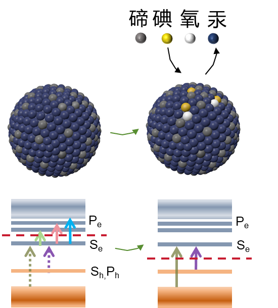 本工作通過薄膜場效應管及雙電位電化學實驗探明了極限尺寸紅外量子點光電探測性能的主要限制是光生載流子漂移長度與傳輸通道長度相比較短。針對該難點,研究組在前期配體交換(Nature Materials 2020, 19, 323–329. https://doi.org/10.1038/s41563-019-0582-2)及表面偶極子摻雜調控(Light: Science & Applications 2023, 12 , 2,https://doi.org/10.1038/s41377-022-01014-0)工作的基礎之上,提出了碘離子配體修飾方法(如圖3所示),鈍化量子點的富金屬表面,實現摻雜精準調控。