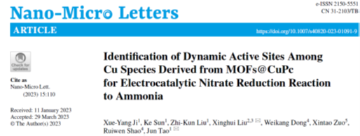 編輯:段凱龍 審核:王振華 閱讀次數(shù):近日,北京理工大學(xué)化學(xué)與化工學(xué)院陶軍教授團(tuán)隊(duì)在電催化硝酸根還原制氨方面取得重要進(jìn)展。相關(guān)研究成果以“Identification of dynamic active sites among Cu species derived from MOFs@CuPc for electrocatalytic nitrate reduction reaction to ammonia”為題,在國際知名期刊《納微快報(bào)》(Nano-Micro Letters)上發(fā)表(DOI:10.1007/s40820-023-01091-9)。該工作以北京理工大學(xué)為第一通訊單位,陶軍教授和韓國成均館大學(xué)的劉性輝博士為共同通訊作者,博士研究生冀學(xué)洋為該論文的第一作者。該文章也得到了北京理工大學(xué)醫(yī)工融合研究院邵瑞文副研究員團(tuán)隊(duì)在雙球差校正掃描透射電子顯微鏡方面的技術(shù)支持。