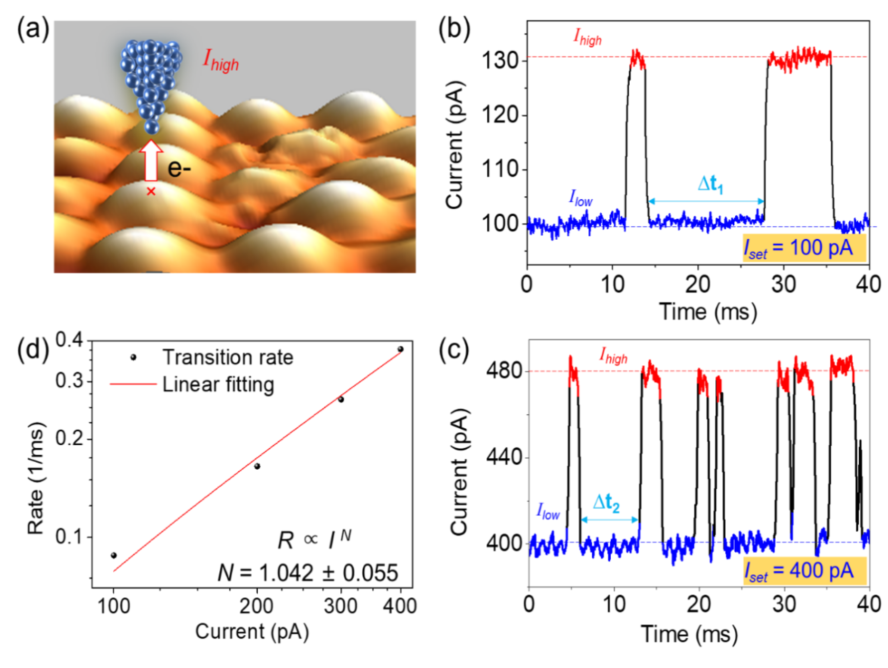 圖1. 利用單電子隧穿實現了CDW陣列雙穩態可逆轉變。(a)CDW陣列在電流驅動下轉變的示意圖。(b, c)電流-時間譜線顯示轉變瞬間的高低電流變化,大的電流驅動使得雙穩態轉變更快。(d)電流-時間譜線統計擬合,滿足隧穿電流與轉變幾率的線性關系,證明了單電子隧穿過程。