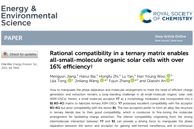編輯:隆哲源 審核:王振華 閱讀次數:近日,北京理工大學化學與化工學院碩士研究生蔣夢云以第一作者身份在國際頂級期刊Energy Environmental & Science (IF: 38.5)發表題目為“Rational compatibility in a ternary matrix enables all-small-molecule organic solar cells with over 16% efficiency”的研究論文,此論文被選為該雜志2021年第7期的Front Cover。北京理工大學為第一通訊單位,北京理工大學安橋石特別研究員、王金亮教授和北京交通大學張福俊教授為共同通訊作者,本研究得到了國家自然科學基金,北京市自然科學基金和北京理工大學青年教師學術啟動計劃等項目的資助及北京理工大學分析測試中心的支持。